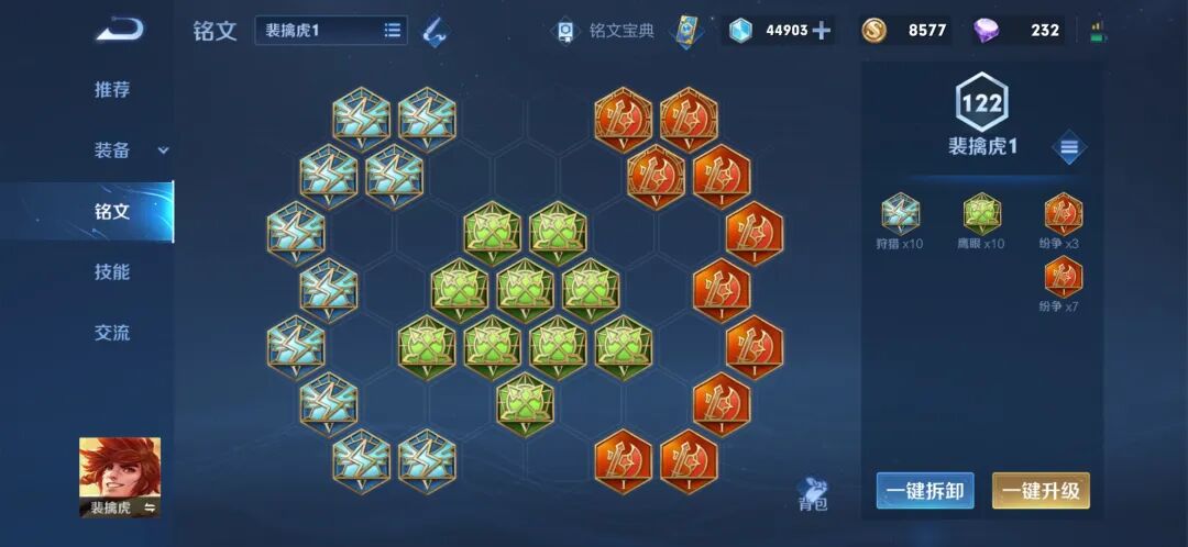 红色异变,蓝色猎杀,绿色鹰眼。异变与鹰眼的组合对裴擒虎的虎形态收割尤为重要,最终狩猎目标是配合裴擒虎人形态2技能特性增加攻速来辅助,因为当前版本的裴擒虎2技能被削,攻速加成改为30%,随后每次提升4%,因此在前期带着狩猎就可以了。