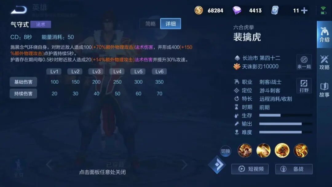 3、二技能:环绕念气。施展念气环绕自身,施法瞬间对附近敌人造成法术伤害,形成护盾包裹自身,护盾可吸收伤害。念气(护盾)存在期间持续对附近敌人造成法术伤害并提升裴擒虎50%攻击速度。