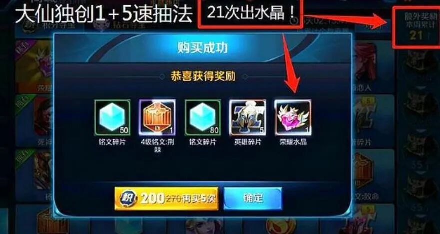 它采用自己独创的“1 5”玄学速抽法,直接21次就抽中荣耀水晶,当时大仙都吓了一跳,按照打折的次数来算,21次积分夺宝一百块钱不到,就获得了一颗荣耀水晶,还不到一款史诗皮肤的价格。