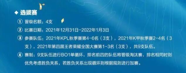 1、选拔赛:BO1单循环,排名前四的队伍将晋级淘汰赛,排名相同时则优先考虑胜负关系,若胜负关系出现循环则根据规则进行加赛。