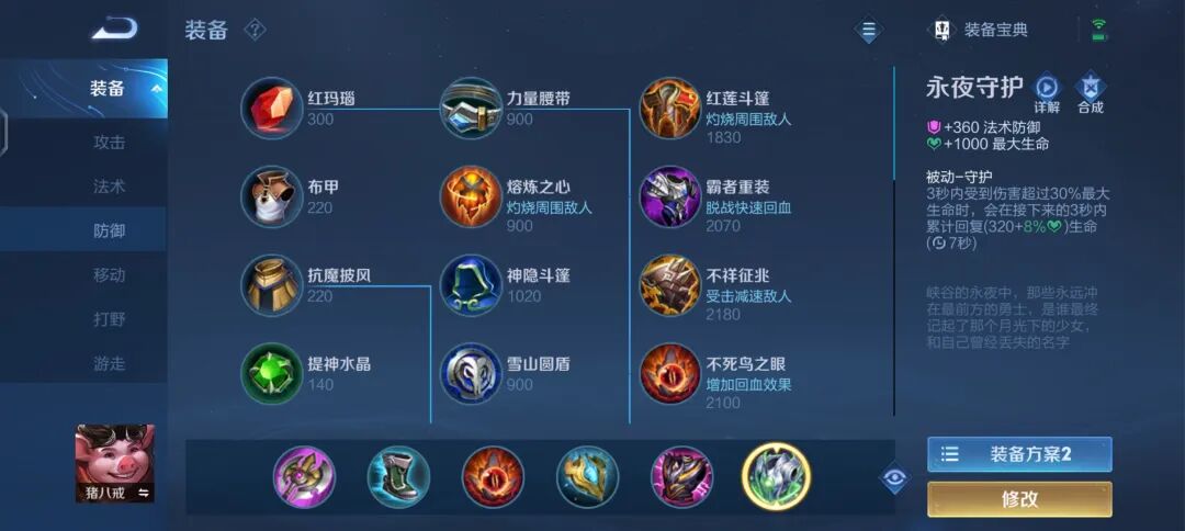 (3)敌方高爆英雄则选永夜守护,永夜在对方物理爆发也相对强时也可以起到抬血的作用。像猪八戒、程咬金、白起这样拥有高恢复能力的英雄在出完不死鸟之后,如果选择第二件法抗装备则选永夜守护,因为永夜守护的回血受不死鸟的加持。同时永夜恢复也受制裁装备的克制,在对方必出制裁类装备且自身不具有高恢复能力的英雄不建议出永夜守护。4.总结