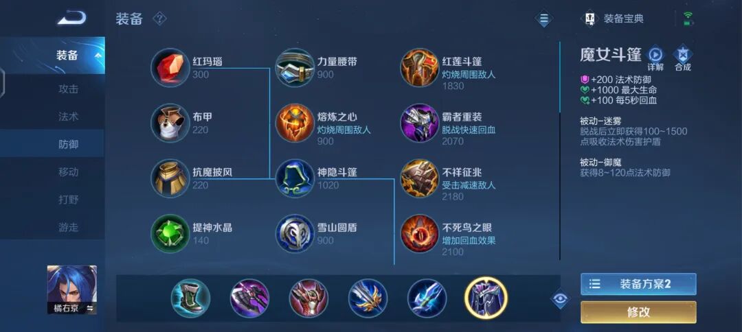 魔女斗篷可以提供200法术防御 、1000最大生命、100每5秒回血。唯一被动-迷雾:脱战后立即获得一个吸收(100 英雄等级*100)点法术伤害的护盾,被动-御魔:获得8-120点法术防御。魔女魔抗随等级成长最高320点法术防御,且可以提高续航能力。
