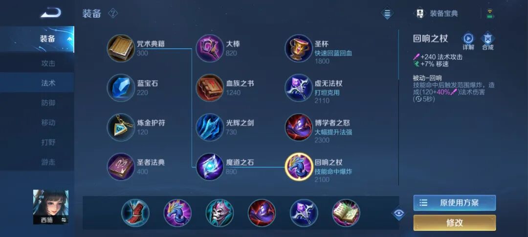 王者荣耀巴掌流西施的出装有:冷静之靴 回响之杖 痛苦面具 博学者之怒 虚无法杖 贤者之书。这套出装全力累积法术攻击,用火力压制敌人,纯伤害向出装,配合大招刷新和2技能双倍伤害的爆发,足以对敌人造成致命威胁。