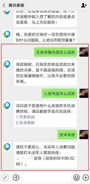 5.第五步进去王者荣耀客服界面之后,输入儿童充值怎么退款,可以看到有未成年人充值客服热线,可以联系客服提交材料进行退款,客服热线时间是早上9点到晚上10点。