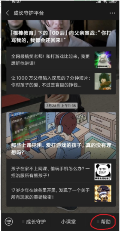 2.接下来需要打开成长守护平台,点击右下角的“帮助”。