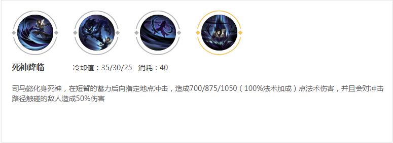 ④三技能:死神降临。司马懿唯一的逃生技能,超远距离位移,一般不用来进场,注意:会给控制技能打断,释放的时候注意对方有没有打断技能!