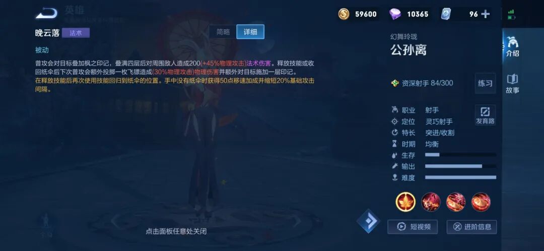被动技能——晚云落阿离的普攻伤害会为目标叠加枫之印记,每四层印记触发一次爆炸(并叠加新的印记),对周围敌人造成其最大生命百分比的法术伤害并减少所有技能的CD;释放技能后阿离的普通攻击将会额外投掷一枚飞镖并造成物理伤害。