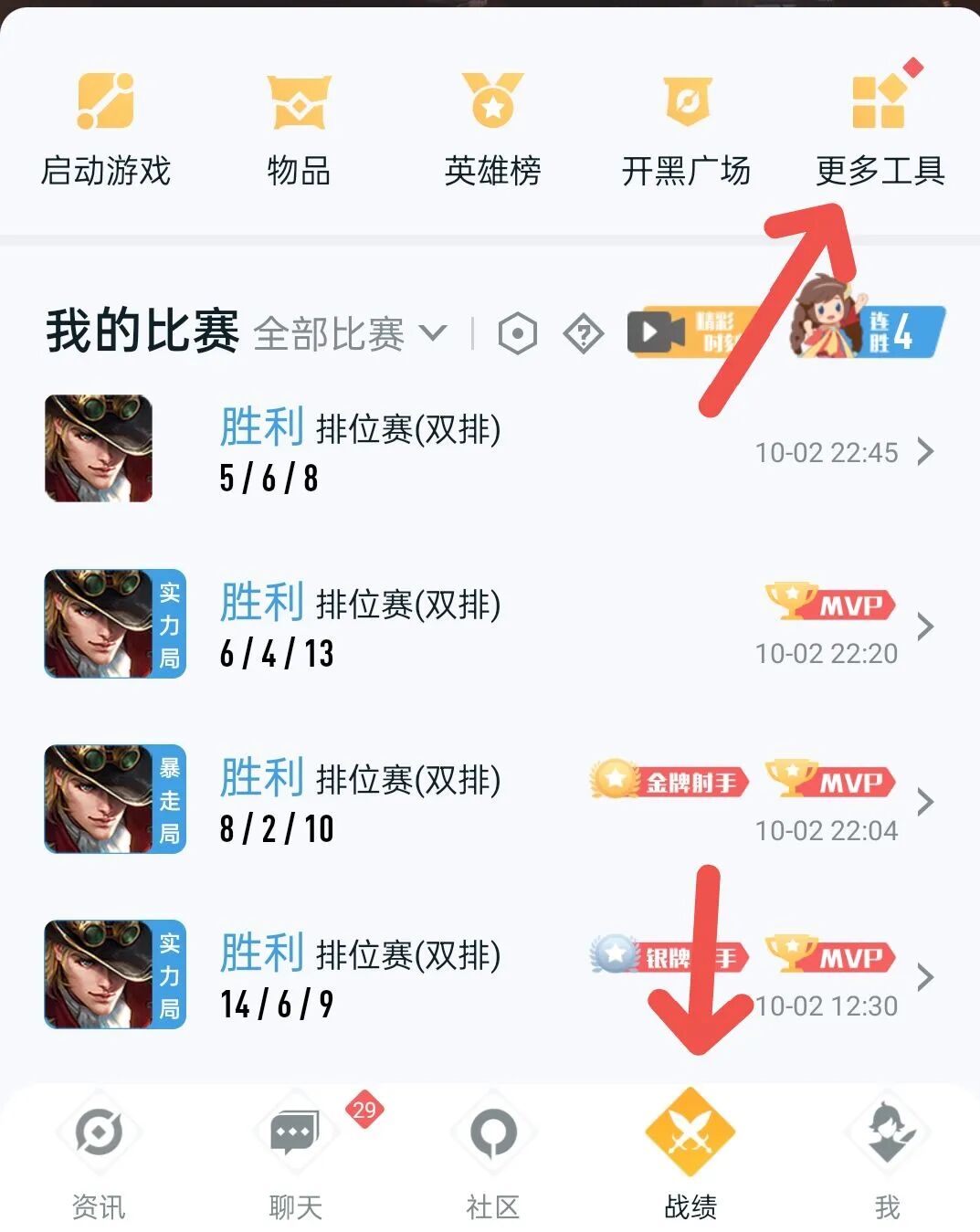 2.打开王者营地并登录要转区的帐号,然后点击战绩,接着点击进入更多工具。
