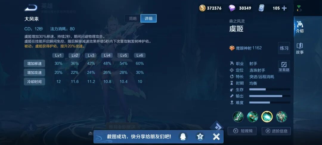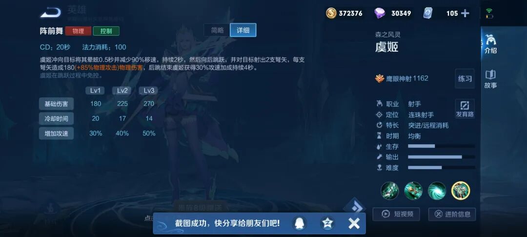 二技能作为虞姬的主要保命技能,可免疫物理伤害。在刺客近身时以及被射手集火使用,有奇效,可完成丝血反杀。另外技能释放瞬间可免疫控制,对释放时机要求高。