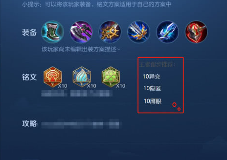 1.推荐五级铭文红色异变、蓝色隐匿、绿色鹰眼,射手没有位移并且需要攻击速度,所以这套铭文最适合不过,加成属性物理攻击,物理穿透,还有移速和攻速,也就是玩家熟悉的物理百穿双速铭文。