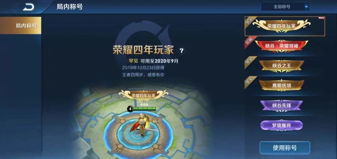 王者荣耀专属称号:荣耀四年玩家、峡谷荣耀领袖、峡谷之王、鹰眼统领、峡谷先锋、边境长史、契约修士、阿离头号粉丝、梦境护卫、契约学徒、峡谷新秀、梦境魔将等等。