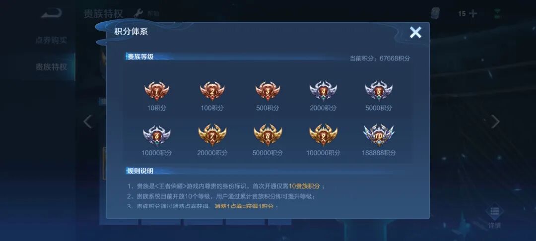 在王者荣耀中,有10个贵族等级,他们需要的价格分别为(这里已转化为人民币价格,10积分=1元人民币):1元,10元,50元,200元,500元,1000元,2000元,5000元,10000元,18888元。