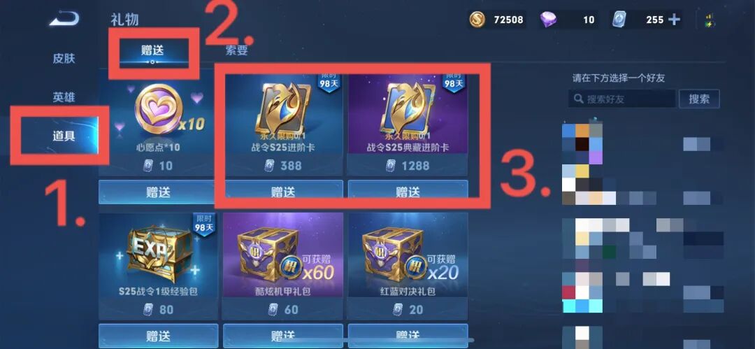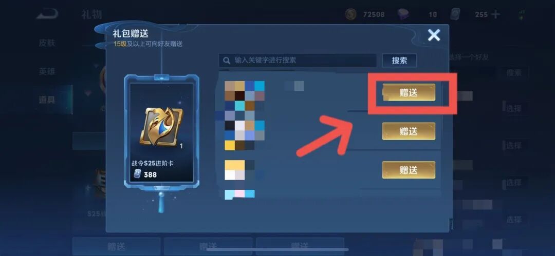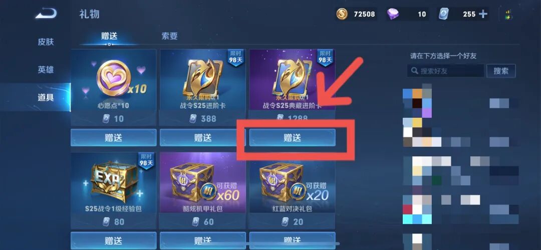 5.最后选择一名好友赠送战令。这里需要注意,两种战令进阶卡只能赠送一种。