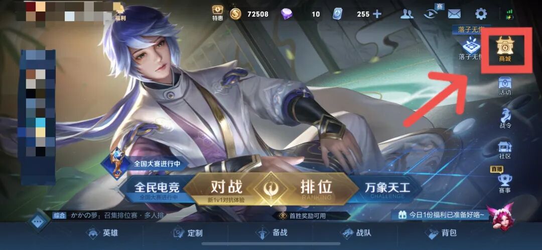 1.打开王者荣耀游戏,点击右上角的【商城】。