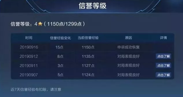 在新版本官方也对信誉经验进行了优化,在每一行信誉经验变动上都增加了“点击了解”按钮,以便召唤师们进—步查看自己的加点和扣点细项,相信大家也会心里比较有底!