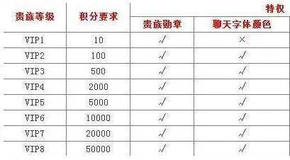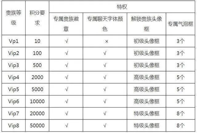 贵族1只需要消耗10积分,贵族2是100分,贵族3是500分,贵族4需要2000,贵族5需要5000,贵族6要10000,贵族7要20000,而位于贵族最顶端的贵族8需要50000分。