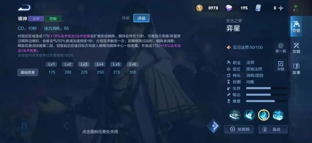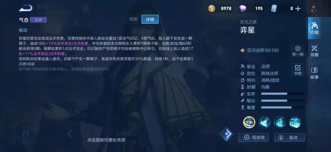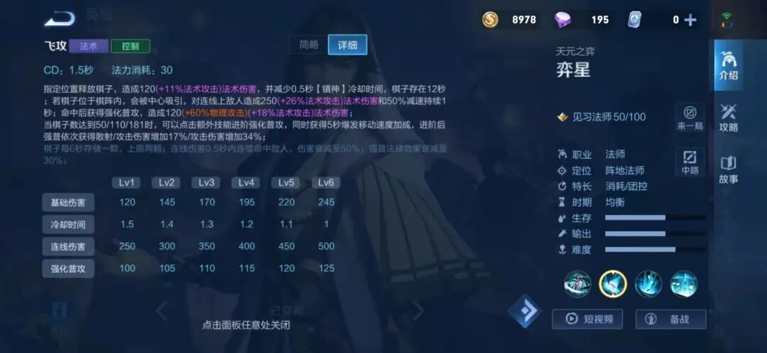 被动:使用技能命中敌方英雄,会为其叠加一层去气印记,四层后,敌方脚下生成棋子,造成法术伤害,同时弈星永久累积一颗棋子数,提供1点法术攻击。受到致命攻击时,弈星免疫所有伤害并提高移速,同时脚下生成棋子。