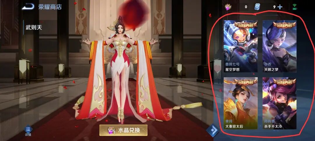 在王者荣耀这款手游中,目前荣耀商店已经出了9个荣耀典藏皮肤,分别是:李白-鸣剑.曳影,武则天-倪克斯神谕,程咬金-活力突击,夏侯惇-无限飓风号,孙悟空-全息碎影,鲁班七号-星空梦想,小乔-天鹅之梦,芈月-大秦宣太后,孙尚香-杀手不太冷。
