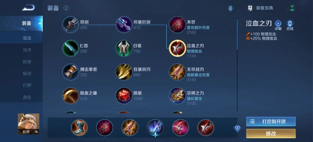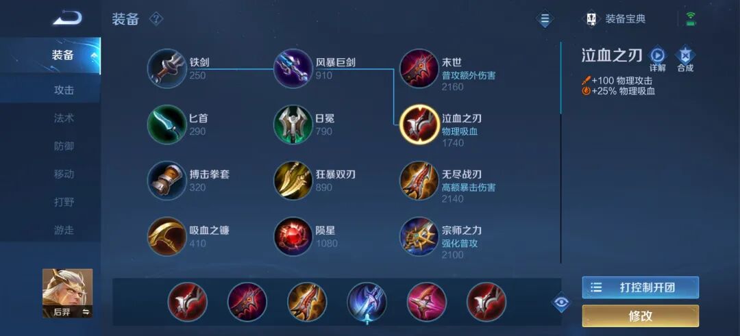 2、这套出装无异于是将后裔的攻速提升到顶峰,而且还有泣血之刃也是配合后裔的攻速将回血能力发挥到极值,所以说这套出装就是后裔96吸血的真谛,只要普通攻击够快够多,多少血都能恢复。