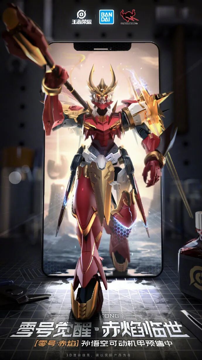 与万代联名推出,邀请万代御用设计师阿久津润一老师设计,展现机甲战神的英姿。同时,基于原稿进行了进一步的加工,在机甲中融入英雄孙悟空的气质,使之更加具有王者荣耀的风格。