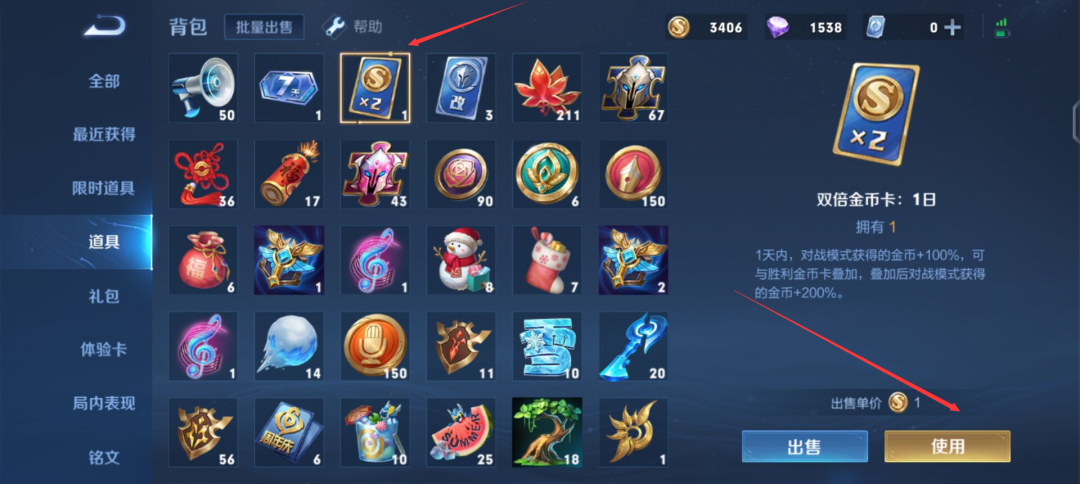 1、游戏玩家在准备刷金币时。一定要将背包中的金币翻倍卡道具使用上。这样就可以获得更多的金币。