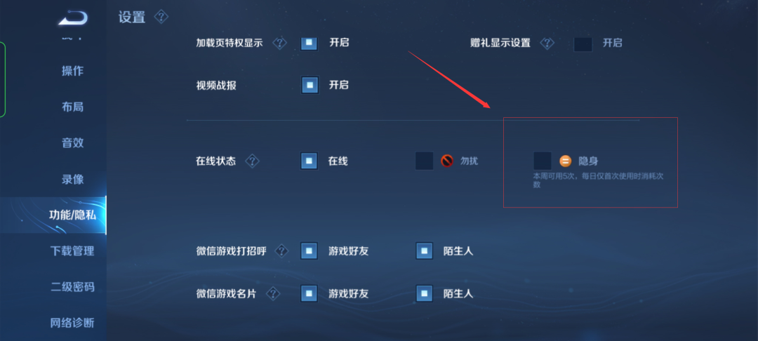 3、功能/隐私往下拉找到在线状态,有在线、勿扰、隐身三个选择,玩家选择隐身即可。