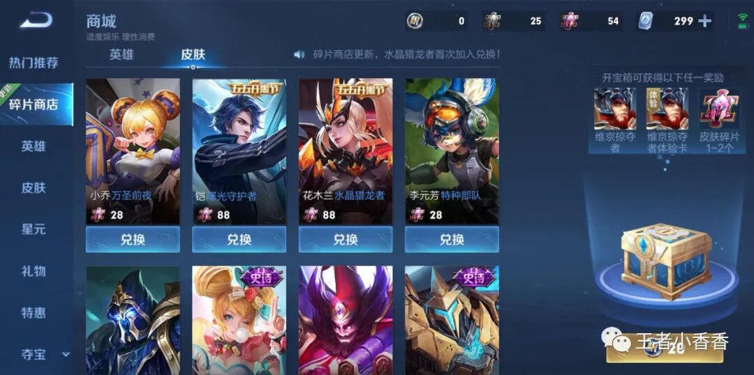 碎片商店中有不少品质不错的史诗皮肤,而且前两天还加入了一款新的史诗皮肤,花木兰——水晶猎龙者皮肤首次加入兑换了,水晶猎龙者皮肤的品质还是非常不错的,只需要88个皮肤碎片就可以直接兑换水晶猎龙者皮肤,不少玩家都已经兑换了。