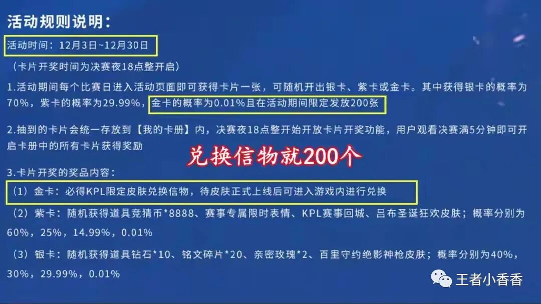 这个新活动的时间是12月3日~12月30日,一般活动结束后皮肤就会上线了,因此可以推测出新KPL皮肤会在元旦节前后上线。在活动期间进入活动页面是有概率开出银卡、紫卡或金卡的,而金卡可以用来对兑换新KPL限定皮肤。