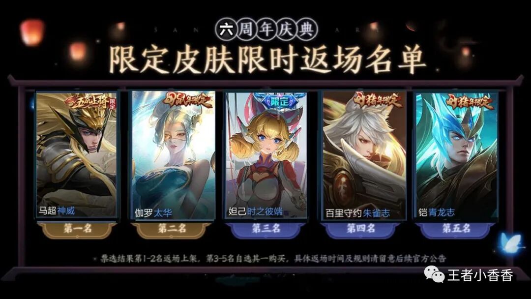 另外要说的就是六周年限定皮肤返场了,很多玩家都是比较关心限定皮肤的具体返场时间的,本次投票位居第一的就是马超——神威,第二是伽罗——太华,第3~5名分别是妲己——时之彼端、百里守约——朱雀志、铠——青龙志,这五款皮肤的返场都是没什么悬念的,因为从投票活动的第一天这五款皮肤的票数就甩了其他皮肤一大截。