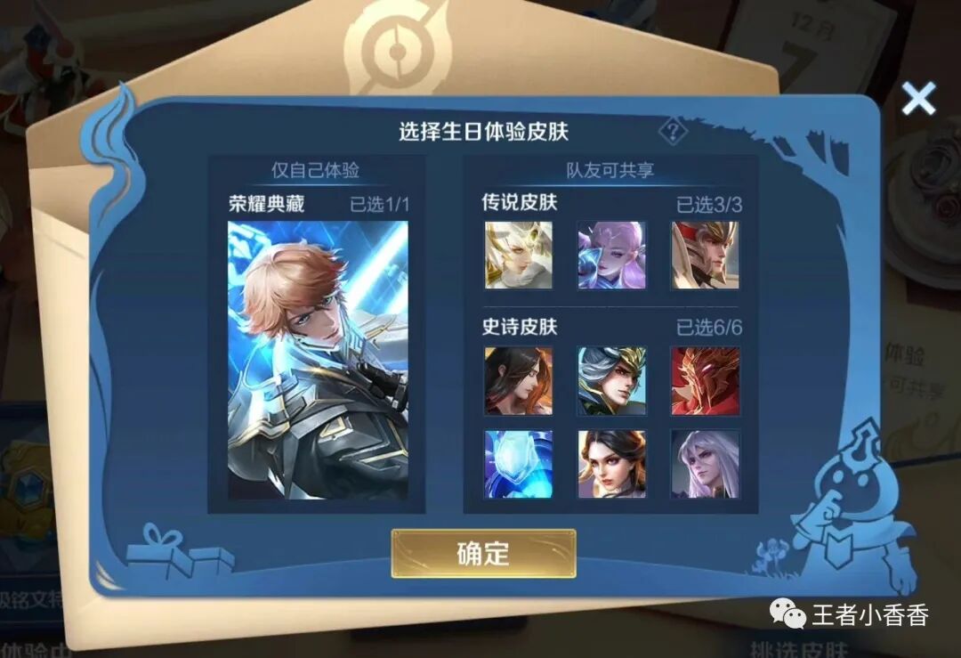 在所有的生日福利中,最良心的应该就是6折皮肤特权和皮肤免费体验特权了,可以免费使用的皮肤包括1款荣耀典藏皮肤、3款史诗皮肤以及6款史诗皮肤,而且传说皮肤和史诗皮肤都是可以与好友共享的,这就意味着所有人都可以免费使用荣耀典藏皮肤。