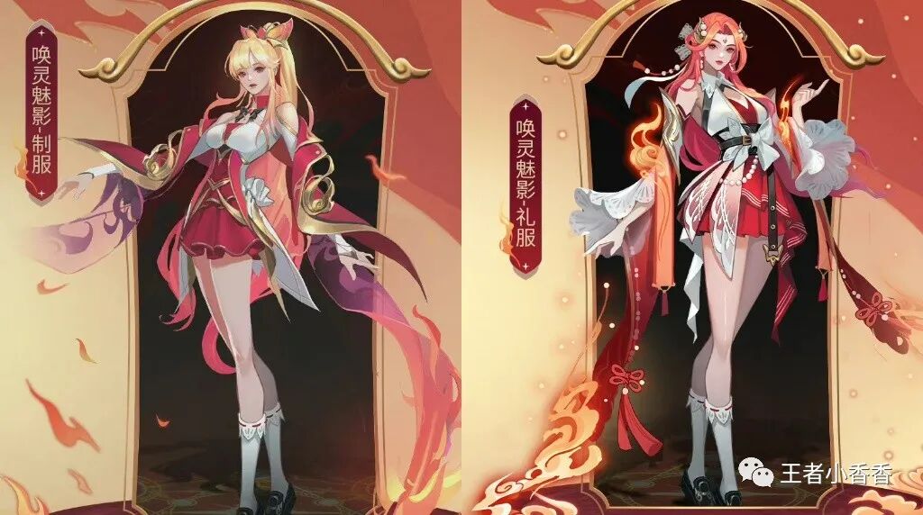 唤灵魅影的两款方案都非常美,方案一的貂蝉一头金色、橘红色渐变高马尾,身穿红、白色制服,看起来充满了青春与活力。方案二的貂蝉一头橘红色长发,发饰用了珍珠和蕾丝的设计,服装是红、白色礼服,腰间缠绕着黑色皮带,手臂上的飘带还有红色中国结装饰,看起来比较优雅性感。