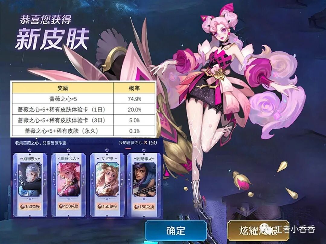 另外,在10月25号每个玩家都可以额外活动一个稀有皮肤幸运宝箱,打开后可以获得5个蔷薇之心,也就是在本次周年庆期间每个玩家最多可以获得45个蔷薇之心,因此目前有105个蔷薇之心的玩家在本次周年庆期间都可以兑换一款稀有皮肤。