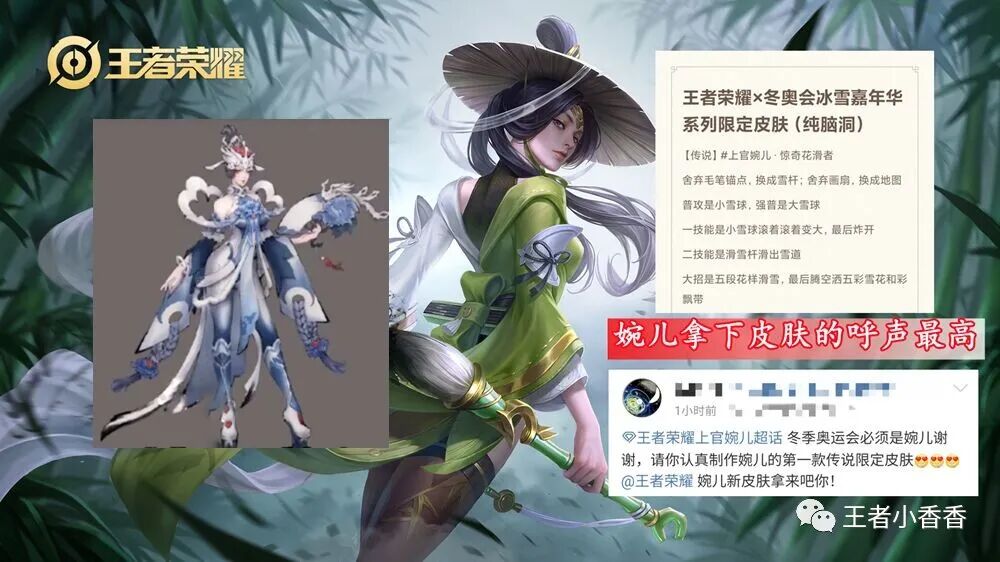 上官婉儿近期确实是有新皮肤计划的,但是至于这款皮肤是什么品质的,目前还不确定,还得等后续的官方爆料,有可能真的是冬奥会联动皮肤。
