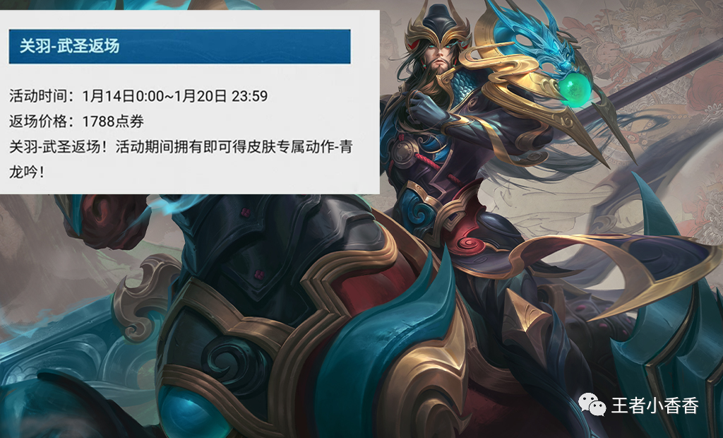 除此以外,在14号还将会限定皮肤返场活动,关羽——武圣皮肤已经确定返场了,返场时间是1月14日~1月20日,需要1788点券获取。另外,在活动期间拥有武圣皮肤还可以获得皮肤专属动作——青龙吟。