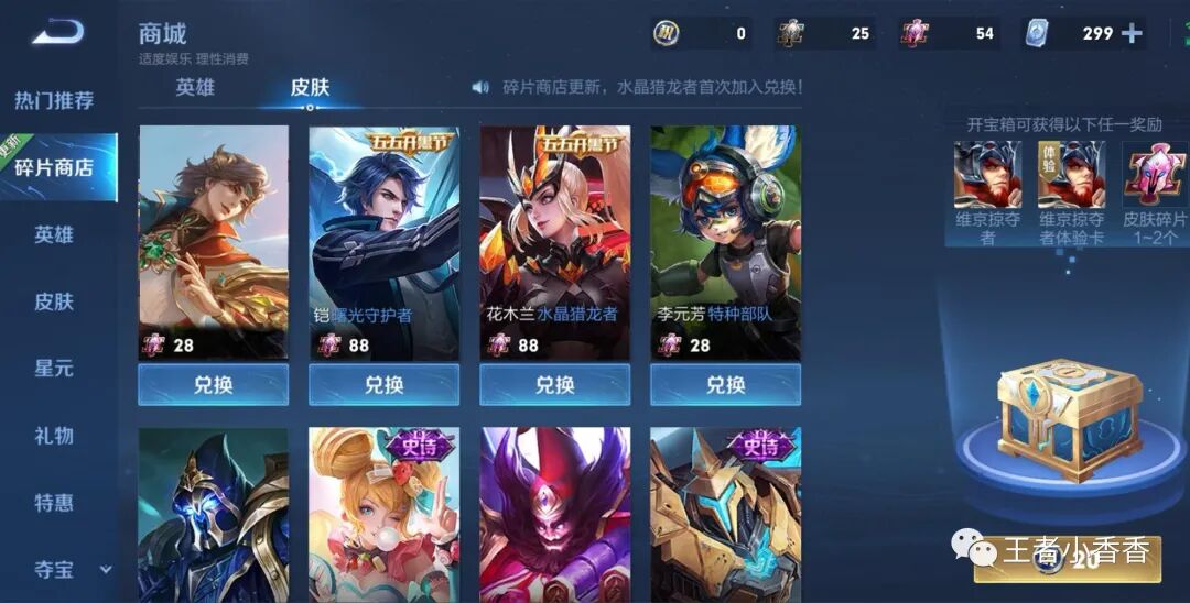 花木兰荣耀典藏皮肤即将来袭,皮肤碎片商店再次更新,蔷薇之心后续活动当中有可能开放钻石兑换方式。