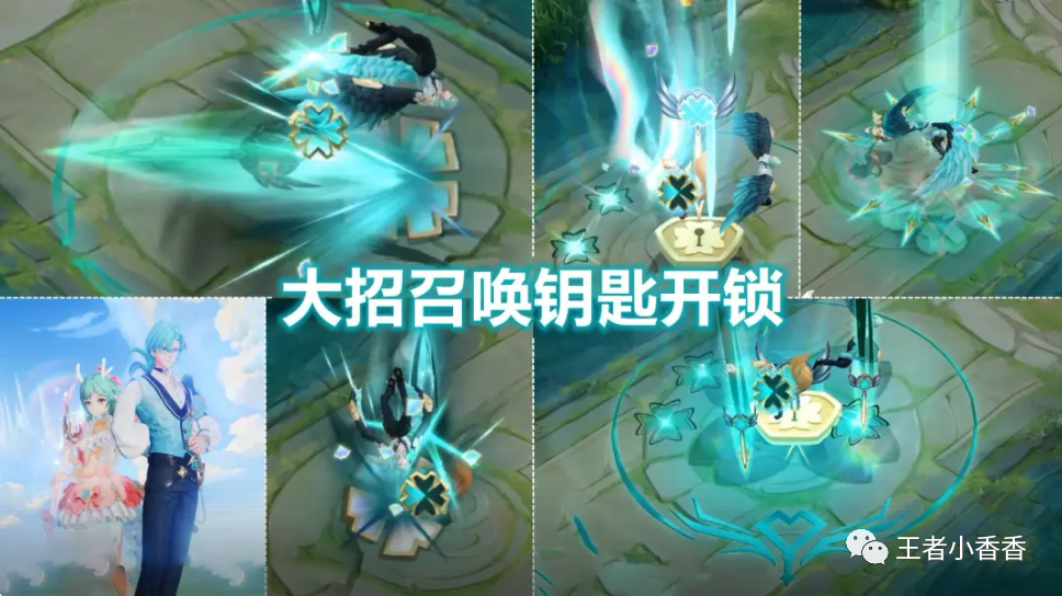瑶——时之祈愿皮肤的技能特效主要采用了魔法四叶草元素,色调是与角色一致的,都是粉、蓝配色。一技能特效是四叶草宝石,二技能特效是四叶草法阵,范围边缘有钥匙、锁等元素,三技能的护盾特效是一个四叶草形状的护盾。