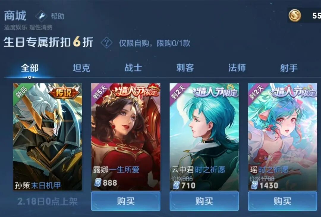 游戏中的生日每年是可以改一次的,可以把自己的生日改到2月18日以后,这样等孙策——末日机甲皮肤上线刚满1年时,就可以利用生日专属折扣入手这款皮肤了,6折就只需要1012点券,比首周折扣还省了338点券呢。