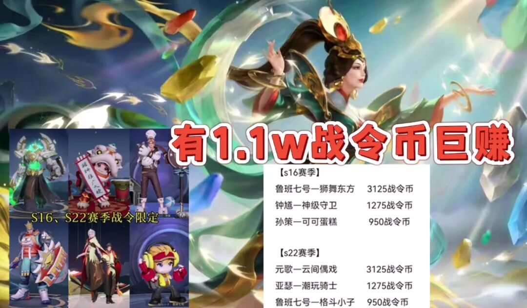 鲁班七号——狮舞东方和元歌——云间偶戏都是80级战令皮肤,保底需要3125战令币,钟馗——神迹守卫和亚瑟——潮流骑士王是1级战令皮肤,保底需要1275战令币,而另外2款战令星元皮肤保底需要950战令币,因此备好1.1w战令币才能把这几款皮肤全部拿到手。