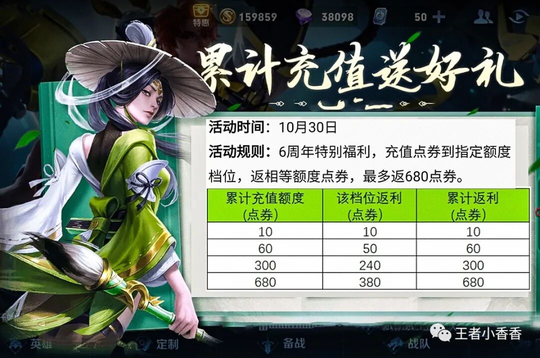 王者荣耀六周年庆典的第五波福利活动就要来临了,在10月30号当天登录游戏就可以领取66~666限时点券,而且还有概率获得永久英雄和皮肤。30号当天还会上线充值返利活动,而且是双倍回馈,充多少就送多少,最多可以返680点券,充680点券总共可以获取1360点券,真的是非常良心了。