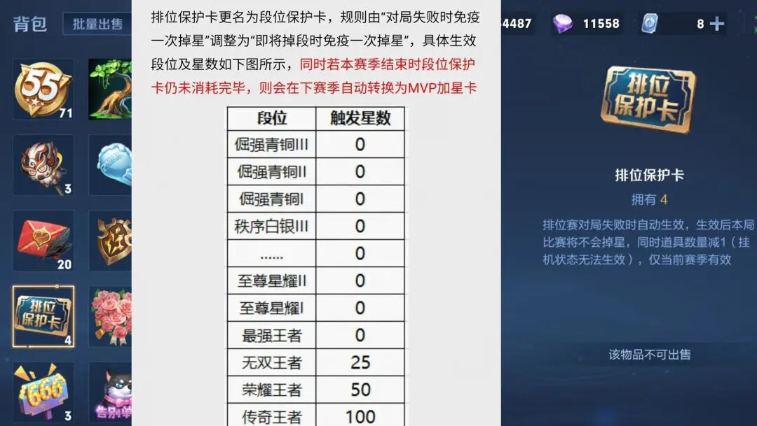 王者荣耀游戏中的排位保护卡、MVP加星卡以及勇者积分机制都是有助于玩家们上分的,而最近排位保护卡进行了调整。在体验服中,排位保护卡改名为段位保护卡,而且生效规则也进行了调整,从原先的掉星保护变成了掉段保护。