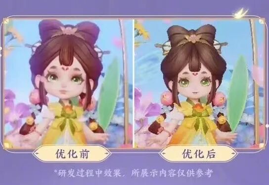 花朝如约皮肤的建模再次进行了优化,不仅建模的头变小了很多,建模的面部表情和神态也调整了。可以看一下优化前后的对比,这个优化成果真的很明显了,优化之后的建模更加可爱了,没有之前土里土气的感觉了。