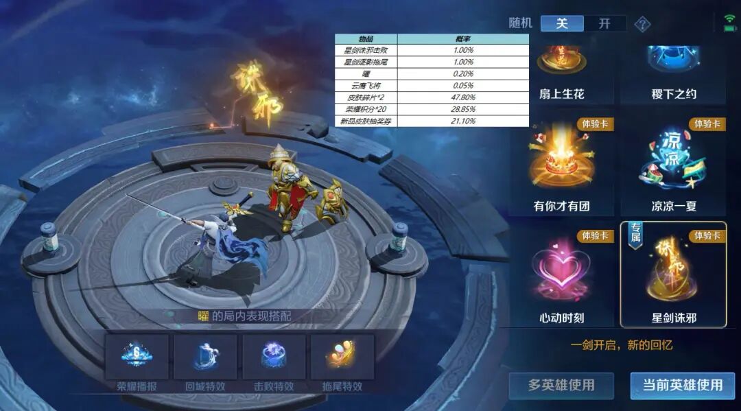 除了曜的星剑诛邪击败特效和星剑逐影拖尾特效以外,这个礼包中还有曜——云鹰飞将皮肤,这是一款传说皮肤,如果运气好的话,可能20点券就可以抽到这款皮肤了。不过,抽这个皮肤是没有保底的,完全凭运气。
