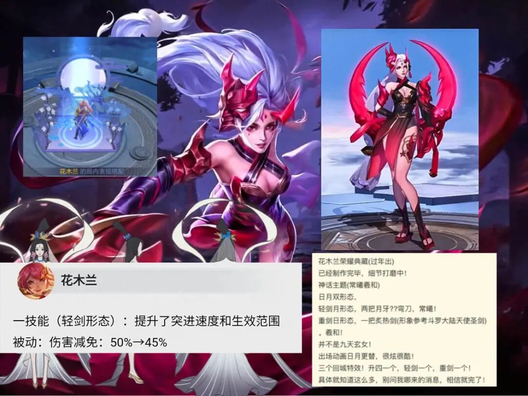 除此以外,花木兰还有一款新皮肤的消息,花木兰目前有一款荣耀典藏皮肤在制作之中,这款皮肤已经基本制作完成了。花木兰的这款荣耀典藏皮肤拥有日月双形态,还有不同的回城特效,听起来还是挺帅气的。