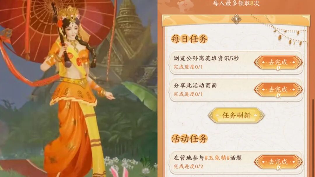 这个活动中的捣药次数是每天都可以获取的,只需要完成每日任务就可以获取捣药次数了,而且任务也很简单,就是分享活动页面和浏览公孙离英雄资讯,非常简单,每天都可以获得2次捣药次数,运气好就能直接抽到玉兔公主皮肤了。