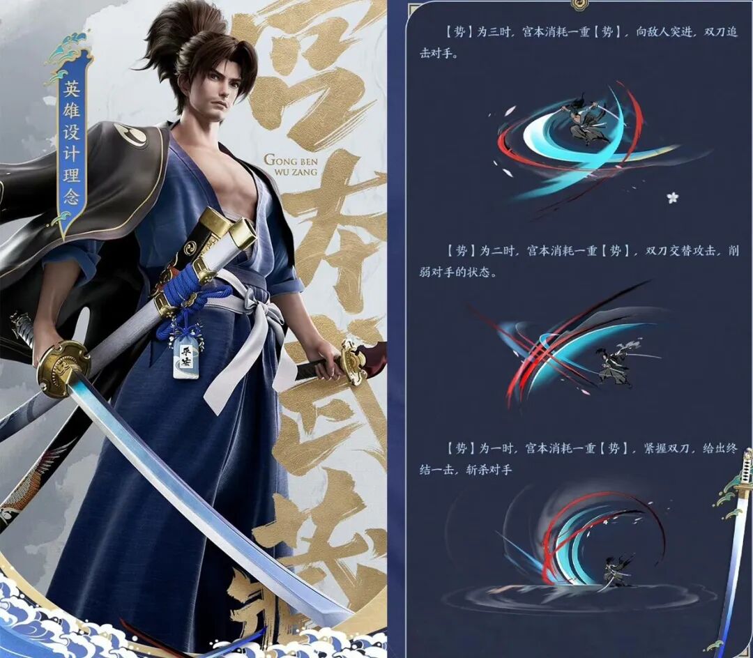 宫本武藏重做后的技能机制也是非常强势,技能机制的叠加方式和云缨的技能机制叠加方式有点类似,使用技能后就能够增加一个“势”,一重“势”就是向前劈砍,二重“势”就是使用双刀打出十字斩的特效,三重“势”就是能够向敌方英雄突进,迅速接近敌方英雄,类似于铠使用二技能后强化一刀指定往敌方英雄身上突进。