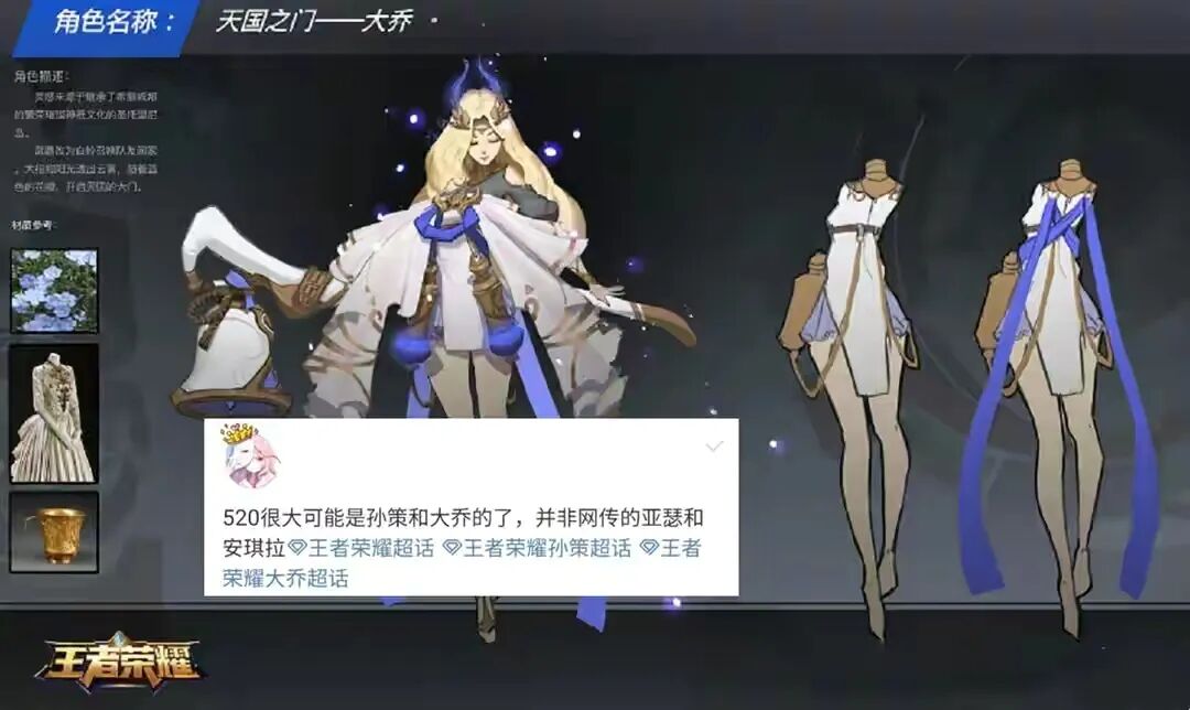 之前有很多消息说520皮肤会给到亚瑟和安琪拉,但是亚瑟和安琪拉至今还没有在共研服中新增皮肤格子,而且在所有情侣英雄中,只有大乔和孙策有皮肤格子,因此520皮肤将会给到大乔和孙策,其中大乔的新皮肤应该是传说品质。
