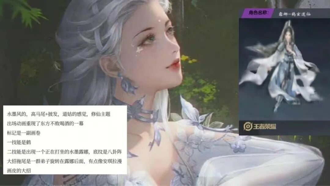 最近,有人爆料露娜这款新皮肤的技能特效是偏水墨风格的,被动印记特效是画卷,一技能特效是仙鹤,二技能特效是出现打坐的露娜,底纹是八卦阵,三技能特效是一群弟子旋转在露娜身后,不过这个爆料信息真实性还不能完全确定。