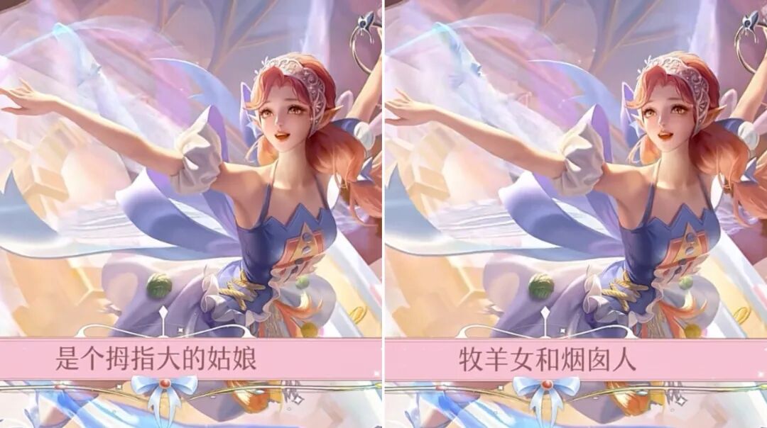 拇指姑娘皮肤是给到安琪拉的,拇指姑娘是从花中长出来的小女孩,因此这款皮肤会采用花朵元素。牧羊女和烟囱人比较适合出情侣皮肤,后续将会给到大乔和孙策,牧羊女一头金色长发,身穿蓝白配色的礼服,看起来还是非常美的。