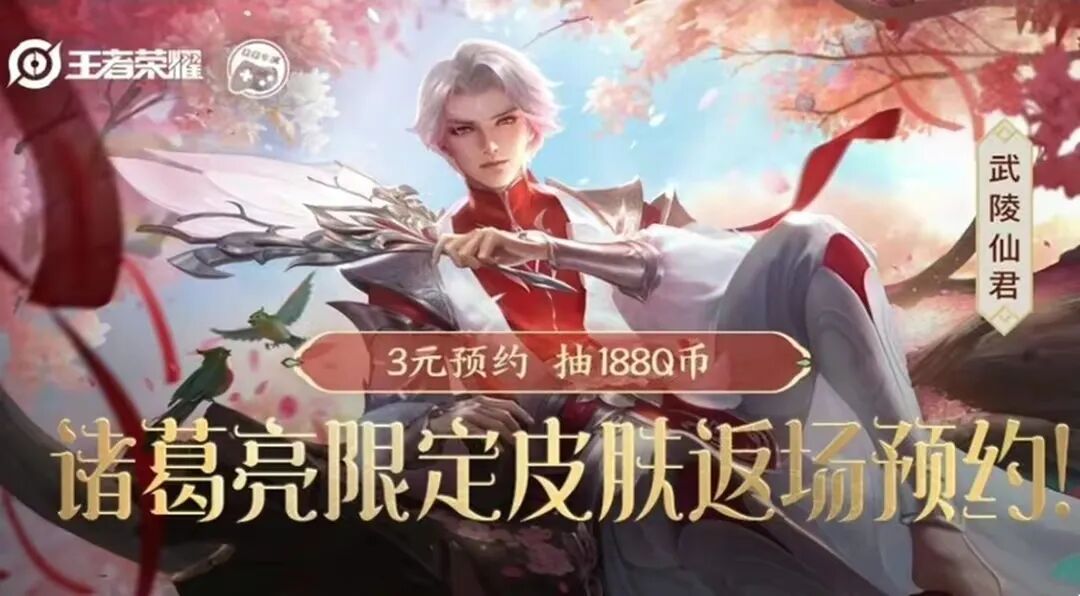 不过,目前在王者荣耀Q区已经开启了武陵仙君皮肤的抢先预约活动,最低可以3块获得这款武陵仙君皮肤。在活动界面可以花3块预约诸葛亮的武陵仙君皮肤,参与预约之后,可以获得3Q币的卡券,后续购买武陵仙君皮肤之后,就会返还3Q币了。