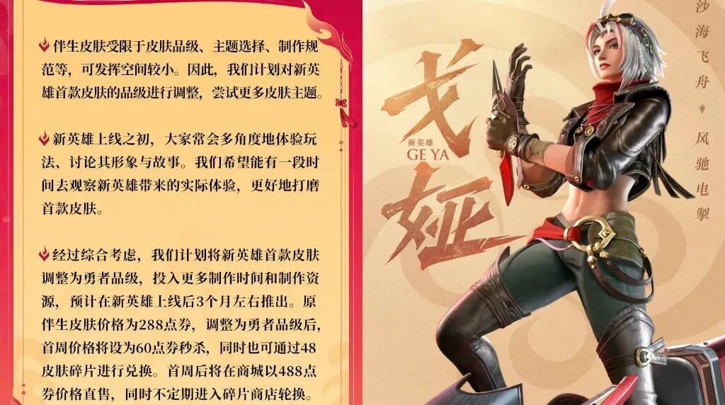 新英雄戈娅的技能曝光后,官方也是宣布对伴生皮肤规则有所改动,原本的伴生皮肤是没有皮肤品质的,此次确定伴生皮肤的品质为勇者级别,而价格方面首周是60点券即可获取,但错过首周后就只能够488点券活动或者48个皮肤碎片在碎片商店当中进行兑换,对比原本的288点券和28个皮肤碎片兑换是涨价了不少。